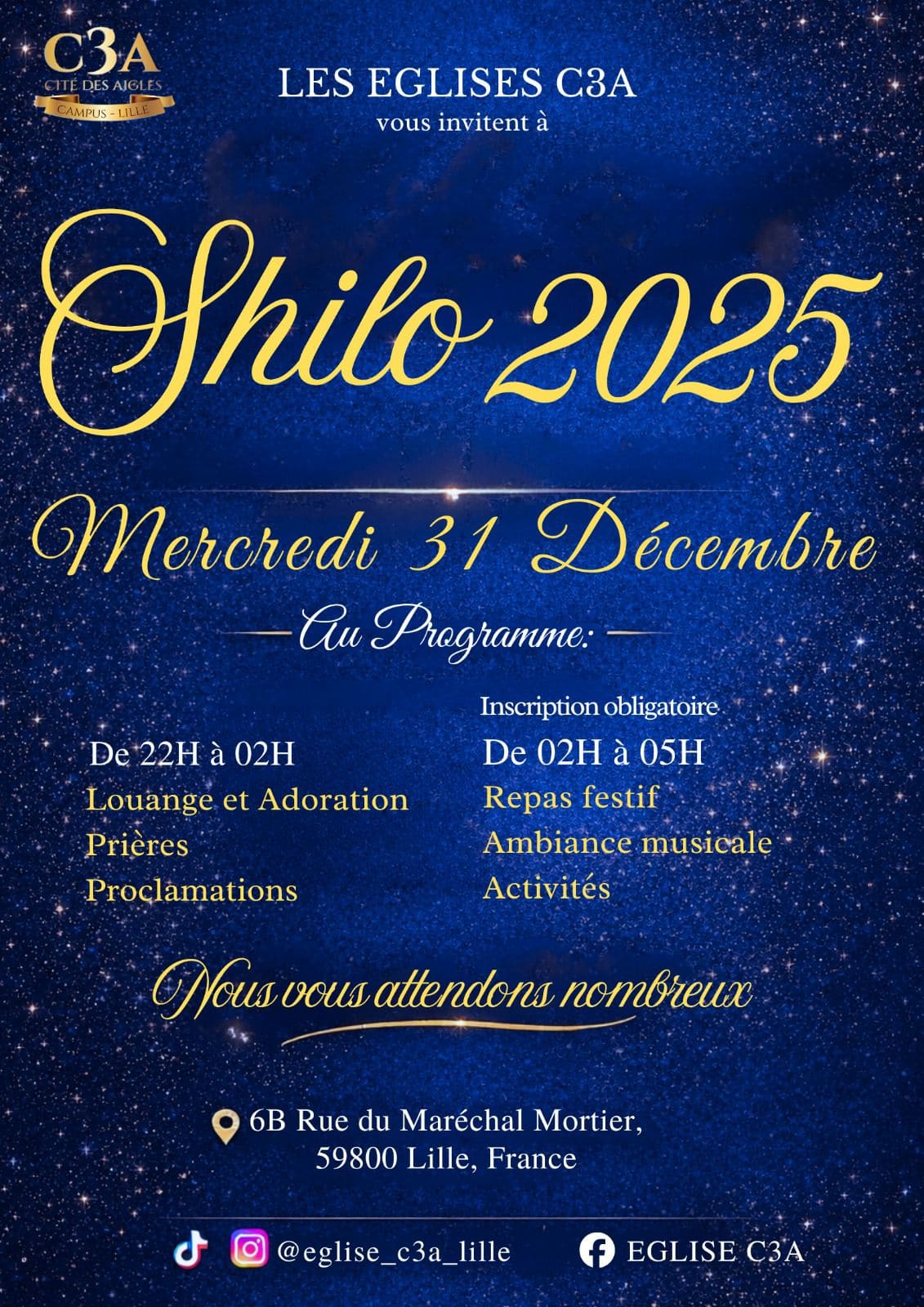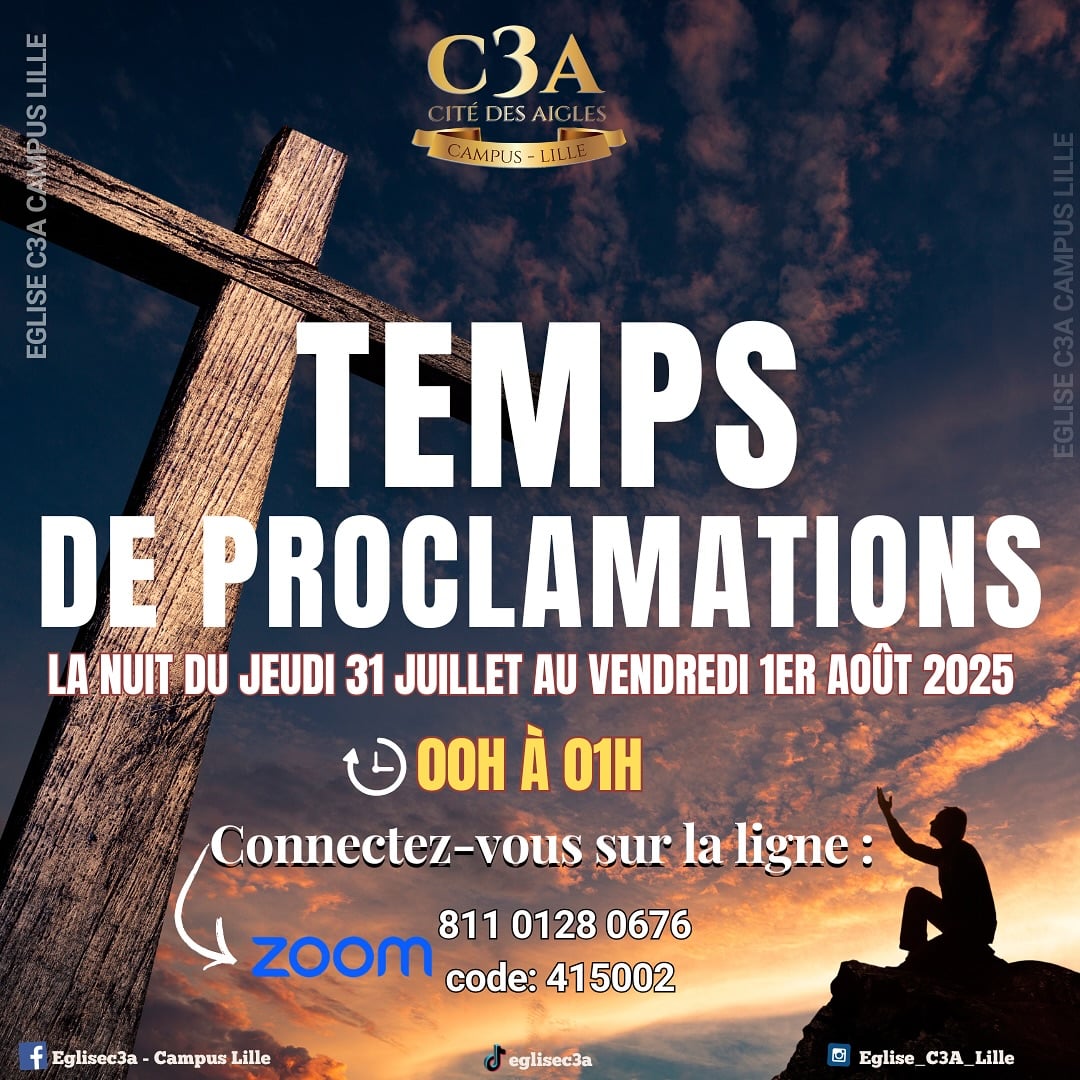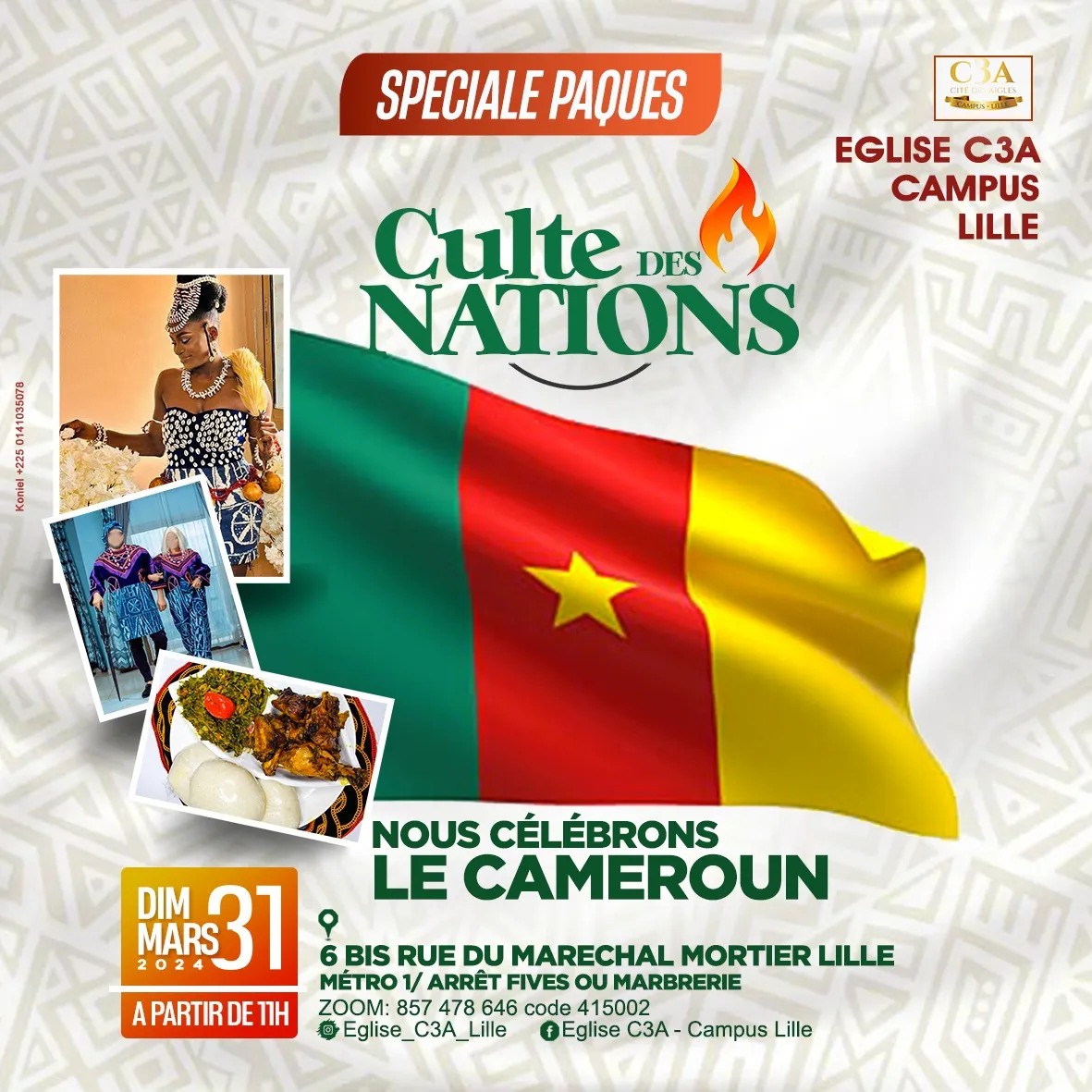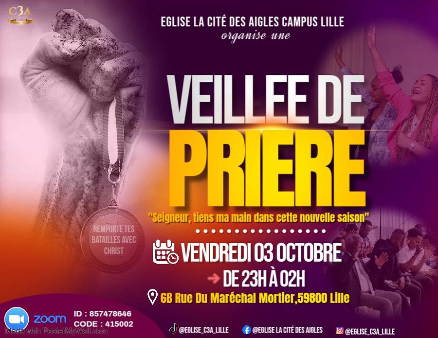 Nos activités Retrouvez nos différentes catégories d’activités. Bien d’autres sont à venir… Shilo (soirée de la travesée) Pâcques Pentecôte Culte des nations Culte de la rentrée Culte des femmes Culte de la jeunesse Camp de prière École du mariage Veillée de prière des ouvriers C3A Soirée d'adoration Camp David Ateliers professionnels Temps de proclamation (chaque début de mois) Temps de méditation Retraite des femmes Évangélisations Veillée de prière Rejoins-nous lors de nos futures activés Évènements à venir